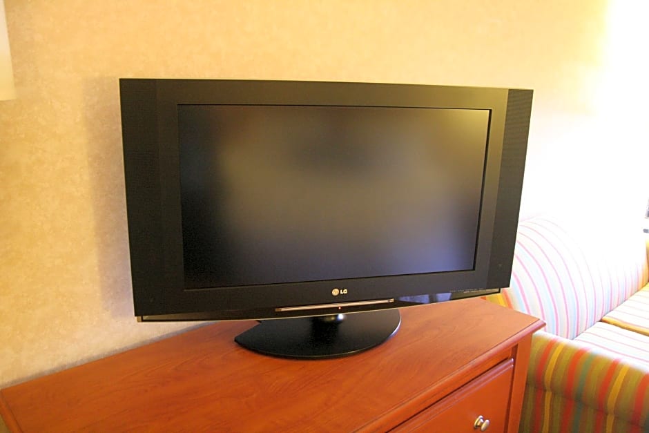 A flat-screen TV is featured in this room that also includes a work desk.