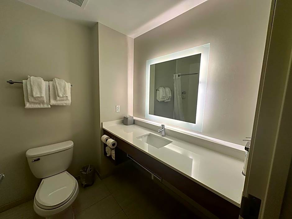 Offering bathroom grab bars and a visual alarm system, this room includes a small refrigerator and a microwave. Free Wi-Fi and a flat-screen TV are provided.