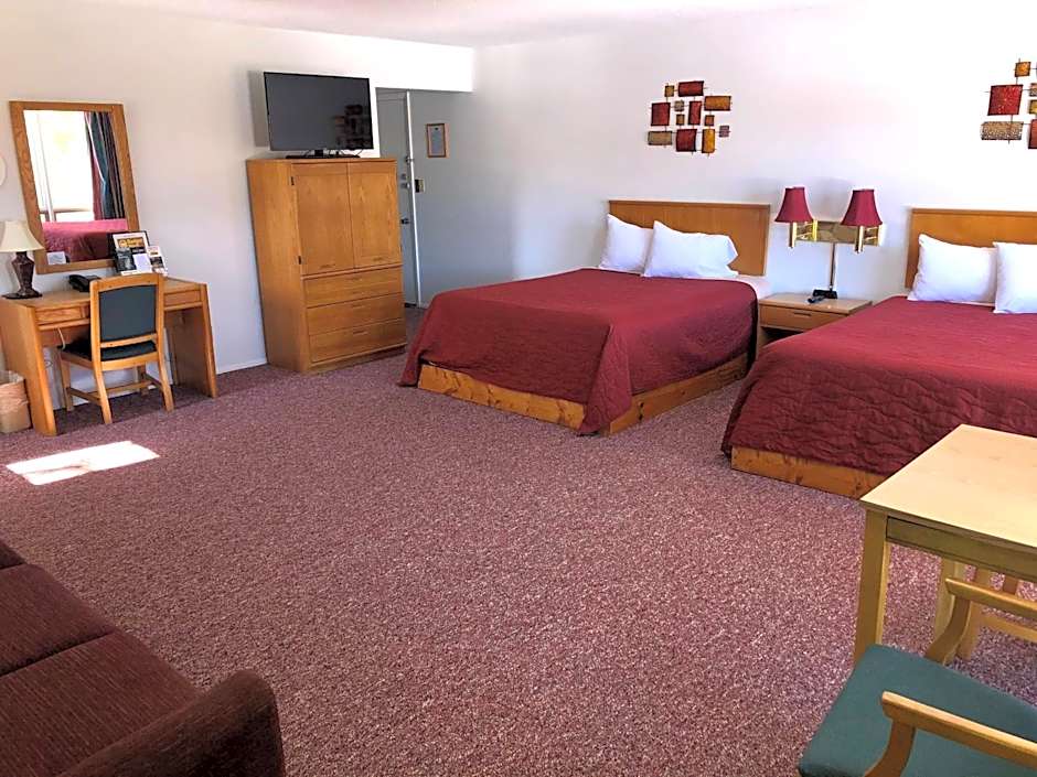 At Budget Host Inn, there are two types of rooms available. The first type is a Standard Queen Room with Two Queen Beds, which can accommodate 4 adults and 2 children. This room is non-smoking and has a room size of 377 sqft. The second type is a Queen Suite with Two Queen Beds, which also accommodates 4 adults and 2 children. This room is larger with a room size of 506 sqft and includes a sofa bed in addition to the two queen beds. Both types of rooms do not allow smoking.