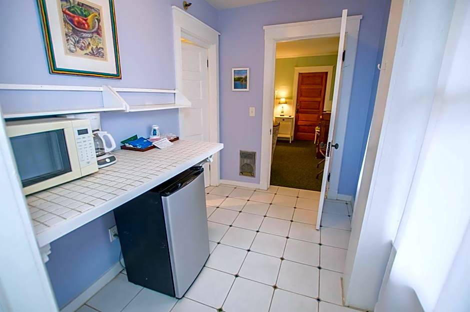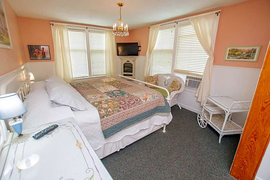 This King Suite has 1 King Bed, cable TV, electric fireplace, jetted tub/shower, a/c, and kitchenette with microwave, mini-frig and coffeemaker. Includes housekeeping on request and daily breakfast.