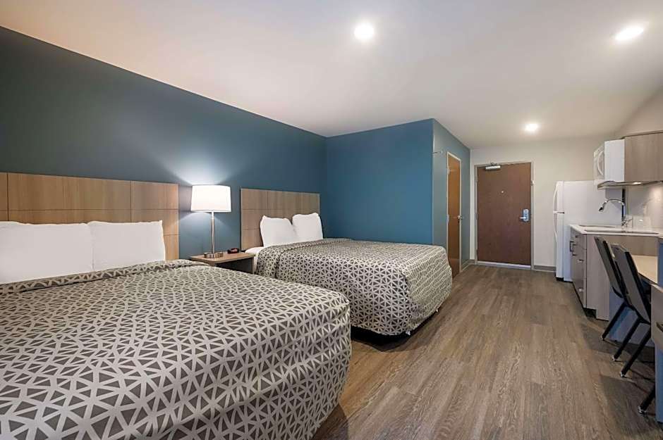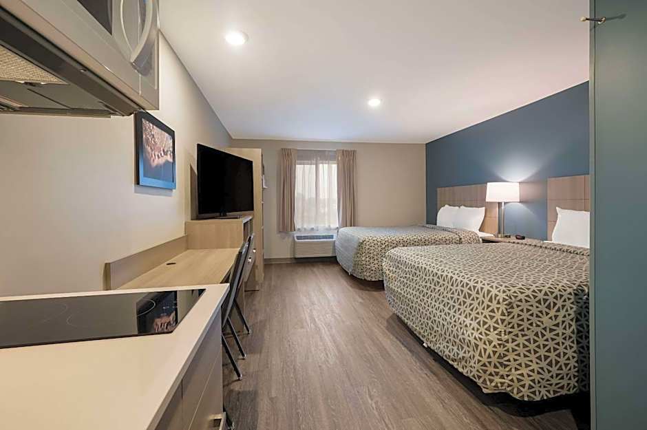 Room options cater to a range of stays, from compact studios to more spacious suites. Notable configurations include Efficiency Suite with 2 Queen beds, Efficiency Suite with a single Queen bed, Suite with 2 Queen beds (474 square feet), Suite with a Queen bed (420 square feet), plus Deluxe Queen and Queen Room options. All layouts are non-smoking.