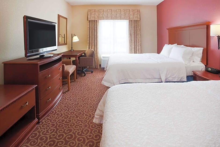The Hampton Inn Fairmont provides several room options including Queen Rooms with Two Queen Beds, Deluxe Queen Rooms, and Queen Rooms. All rooms are non-smoking and offer spacious accommodations ranging in size from 248 to 323 square feet. The rooms can accommodate either three adults and two children or five adults and four children, and the bed sizes vary between one and two Queen beds.