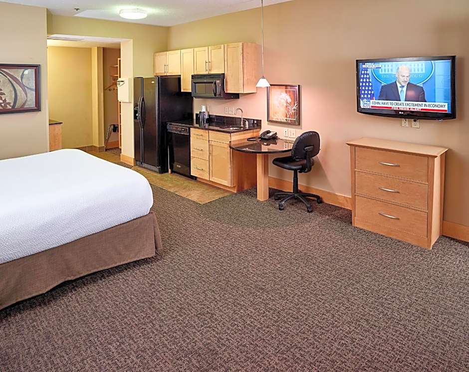 Offering a kitchenette with a wet bar, dishwasher and full-size refrigerator with an icemaker, this large room includes a flat-screen TV with premium cable channels.