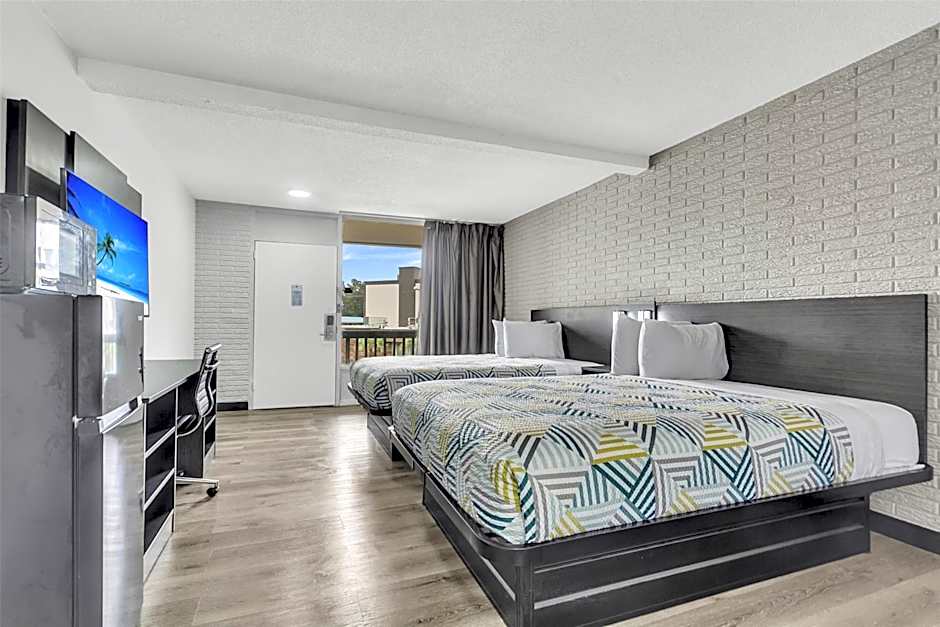 The hotel offers studio rooms with different bed configurations including two double beds, one king bed, and one queen bed, accommodating up to 4 adults and 3 children, 2 adults and 1 child, and 2 adults and 1 child respectively. All rooms are non-smoking with a room size of 301 sqft.