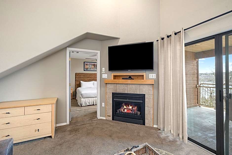 Condo, 1 Bedroom, Kitchen, Lakeside This apartment features a kitchen, a separate living area with a sofa bed and fireplace, and a lakefront balcony.