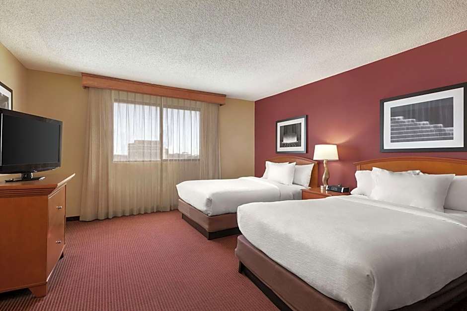 Refreshment center access, WiFi, Keurig coffee brewer are all included in our Premium Suites. Refreshment centers on these floors come stocked with non-alcoholic beverages, and snacks. All of our suites include complimentary cooked-to-order full breakfast and Evening Reception featuring beer, wine, premium spirits and light snacks. This 420 sq. ft. mobility accessible premium suite features two double beds, and an accessible tub. The Embassy Suites Kansas City International Airport Hotel is happy to provide accessible suites to any of our guests with special needs. Featuring an accessible bathtub with grab bars, these two-room suites also offer plenty of space for guests to maneuver including a separate living room and bedroom area. Each suite, as well as our lobby area, is equipped with WiFi access (fee). Any corresponding photo may not reflect the specific accessible room type or room feature.