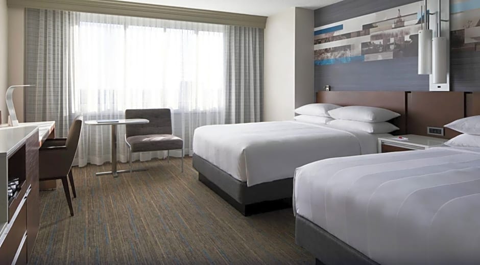 The Kansas City Marriott Country Club Plaza offers a variety of rooms with different sizes and bed options. The rooms range in size from 344 sqft to 484 sqft. All rooms are non-smoking. The rooms accommodate anywhere from 2 to 4 adults, with options for additional children. Beds include queen size, king size, or two queen beds, with some rooms also featuring a sofa bed.