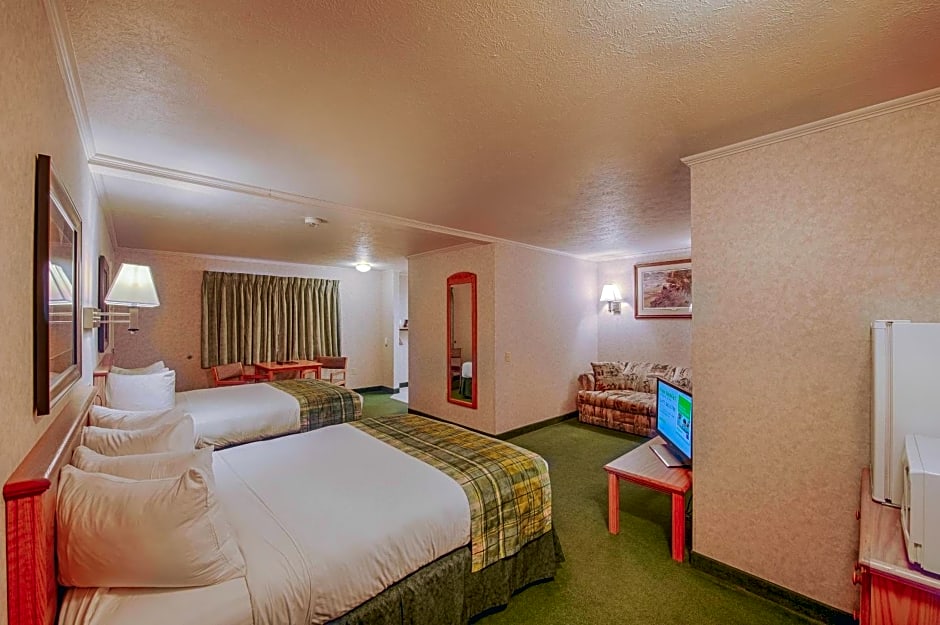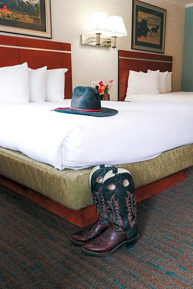 The Brandin' Iron Inn offers Queen Rooms with either one or two Queen beds. The Queen Room is a double occupancy room with a bed size of Queen, while the Queen Room with Two Queen Beds is designed for families and can accommodate up to 4 adults and 2 children. Smoking is not allowed in any of the rooms.