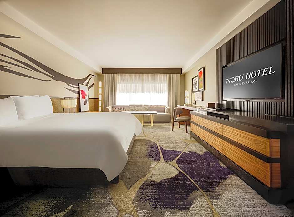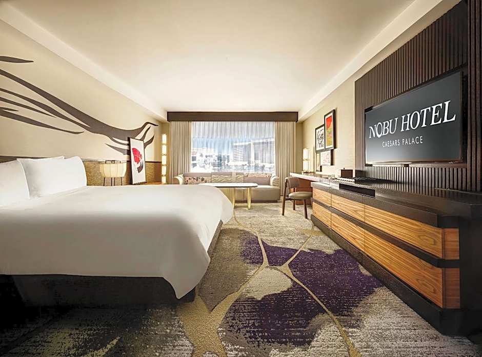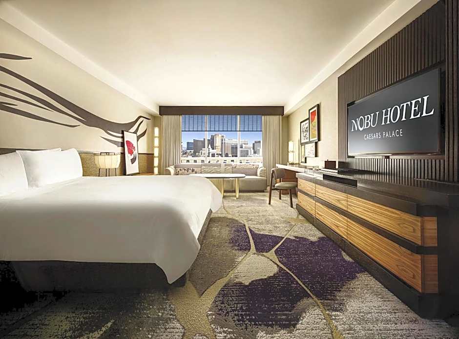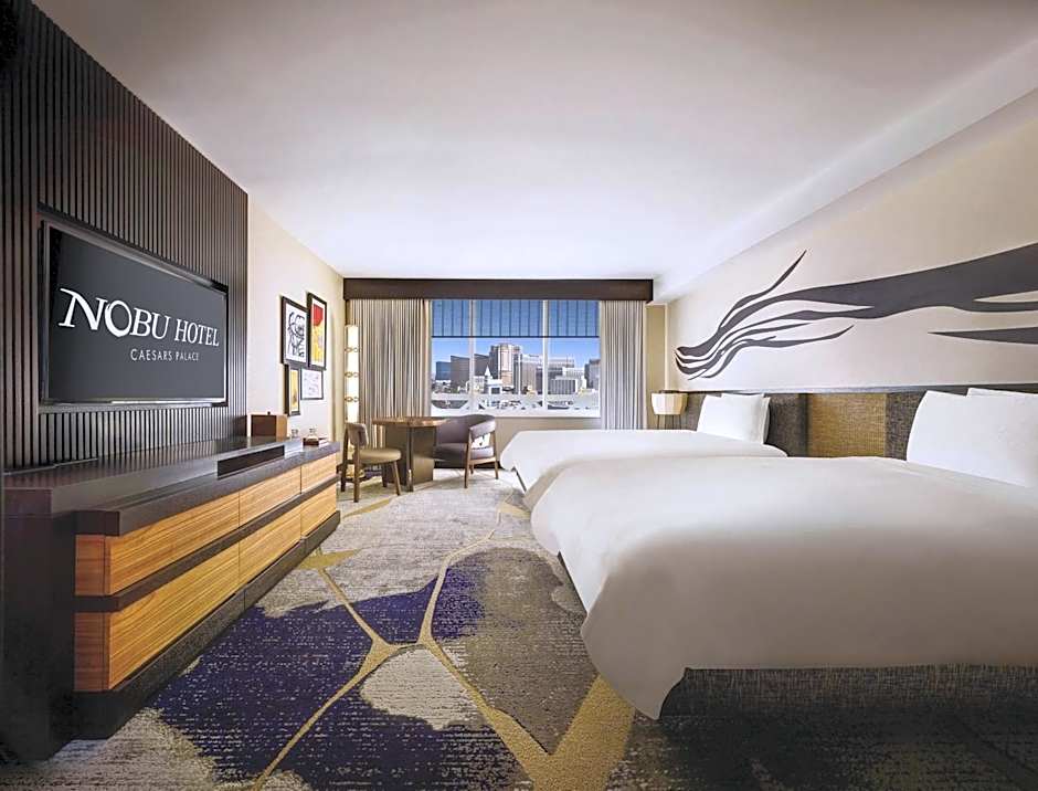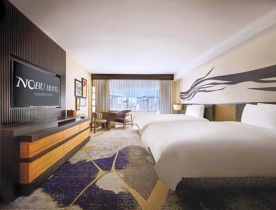 Nobu Hotel, tucked within world-famous Caesars Palace has reimagined luxury with the newly renovated Nobu Strip View rooms. The newly designed décor is inspired from kintsugi, the Japanese art of repairing broken pottery with gold epoxy and features two queen beds, a 55" TV and dining table. With personalized service and lavish amenities, guests of Nobu Hotel receive dedicated Concierge service and enjoy access to priority seating in Nobu Restaurant.