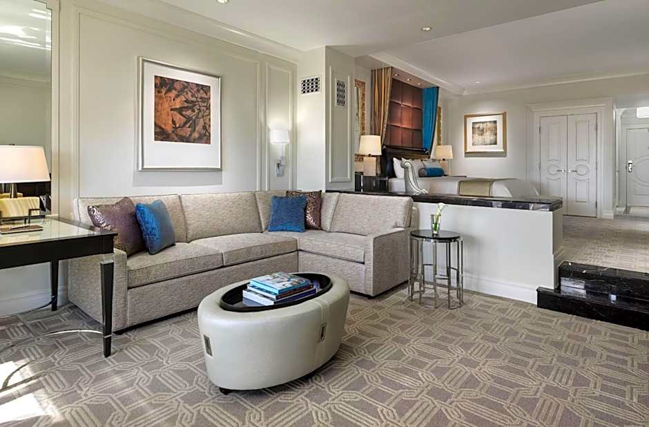 This 720 square-foot suite features a sunken living room where you can lounge solo or entertain guests while overlooking the city or the pools. The bedroom area has a king bed, a 32-inch flat-screen high-definition television and overhead reading lights. The bathroom is marble-appointed with oversize bath sheets and has a 17-inch flat screen HDTV, a separate tub and glass-enclosed shower, private toilet and his-and-her sinks. The living room area has a sofa (with full-size pull out), table with chairs, desk with chair and 32-inch flat-screen HDTV with DVD player and a refreshment center.
