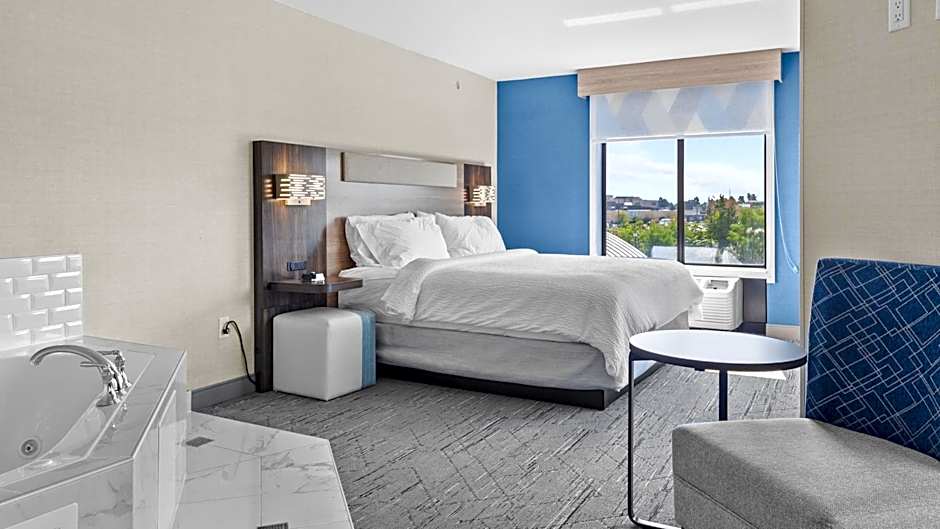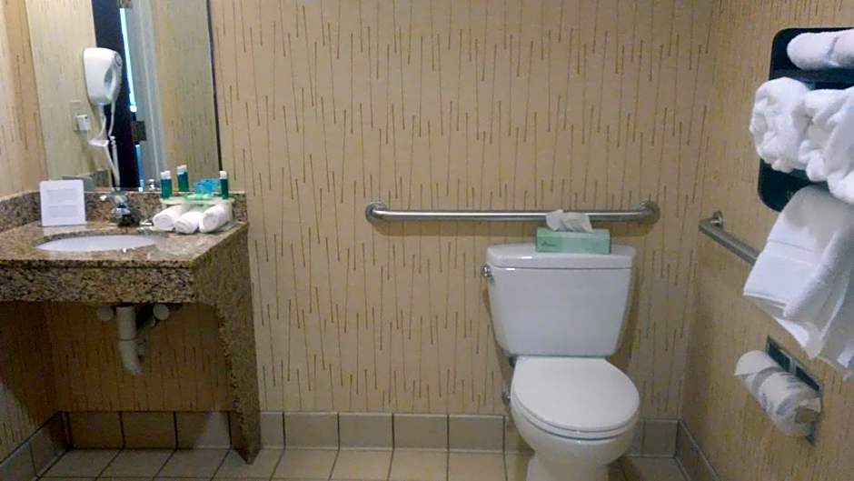 The Holiday Inn Express Hotel & Suites Manchester - Airport offers a variety of room types including queen rooms with two queen beds, king rooms, twin double rooms, deluxe king rooms with mobility accessible tubs, queen suites, executive king rooms, and deluxe king suites. Smoking is not allowed in any of the rooms. The bed sizes range from queen to king, and the room sizes vary from 301 sqft to 409 sqft. The rooms can accommodate varying numbers of adults and children, with the maximum capacity for adults being 6 and for children being 4.