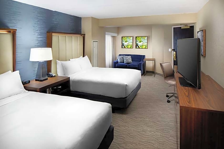 The DoubleTree by Hilton Nashua offers a variety of rooms including double rooms with two queen beds and a bathtub, queen rooms with two queen beds, king rooms with mobility accessibility and a bathtub, queen rooms with mobility accessibility, king rooms with mobility accessibility, king rooms with hearing accessibility, king suites with a living room, and standard king rooms. All rooms are non-smoking and have an occupancy of either 2 adults and 1 child or 4 adults and 3 children.