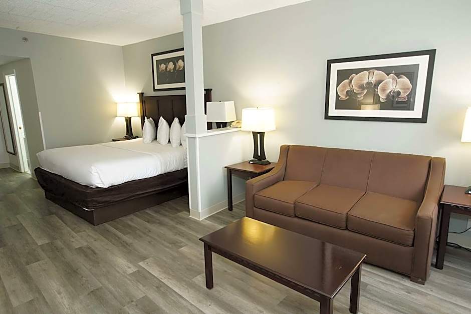 The hotel offers a variety of rooms including King Room with Roll-In Shower, King Room with Whirlpool, Queen Room with Two Queen Beds, Large King Suite with Sofa Bed, Queen Suite with Mobility Accessible Roll-In Shower, King Room, Two-Bedrooms King Suite, and King Suite with Sofa Bed. Smoking is not allowed in any of the rooms. The rooms accommodate 2-4 adults and 1-3 children, with bed sizes ranging from King size to Queen size.