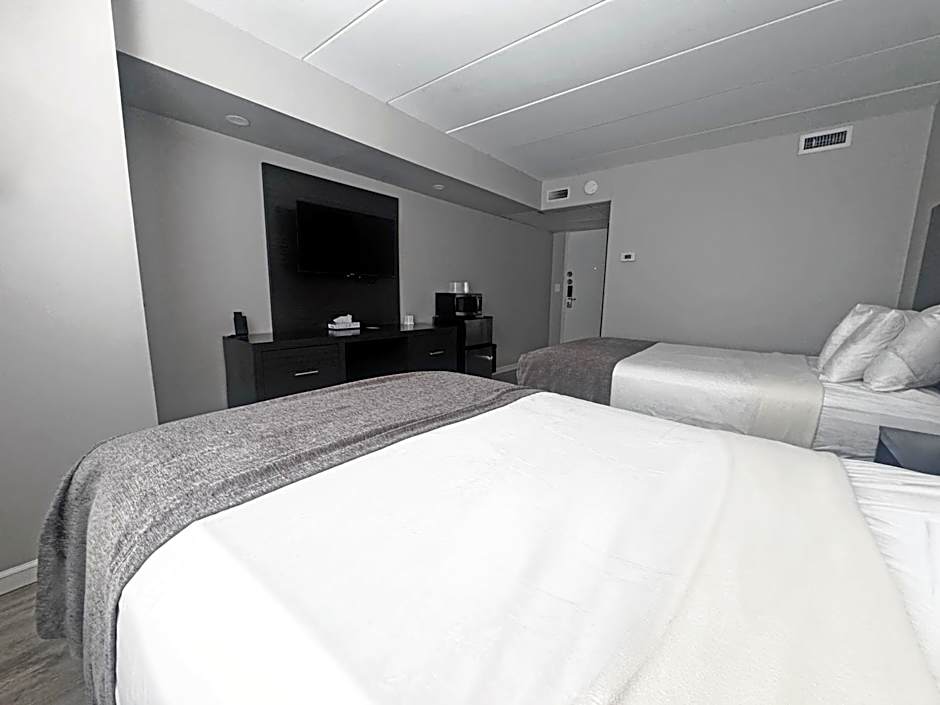 Located in the three-story motel section of the resort, this unit has 2 king beds and a sofa bed. It also features views of Oak Avenue, microwave, small refrigerator, bathroom and TV. Elevator access to this room is not available.