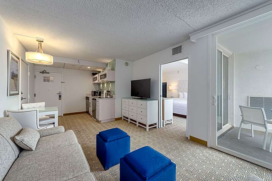 Featuring views of the Atlantic Ocean and the white sands of Diamond Beach from each private balcony, this suite has 1 queen sofa bed in the living room and a galley kitchen with compact refrigerator, microwave, dishwasher, stove top, Keurig® coffee-maker, cookware and dishware. The bathroom is only accessible through the bedroom.