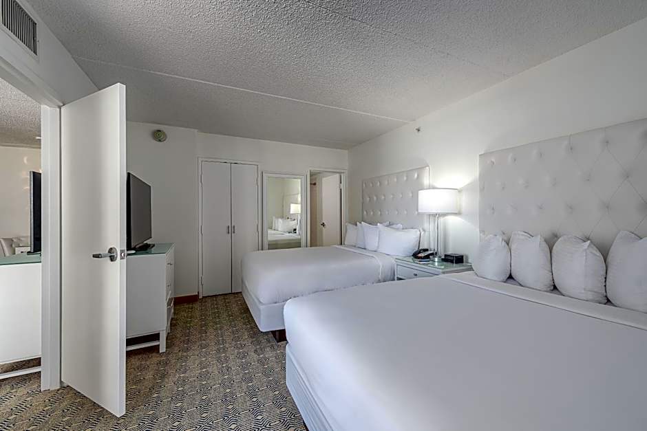 Located on the south side of the building, guests will enjoy both pool and expansive ocean views from the private balcony. Premium Poolside Double suites feature one queen and one full bed in the bedroom, one queen sleeper sofa in the living room, and a galley kitchen with compact refrigerator, microwave, dishwasher, stove top, Keurig coffee-maker, cookware and dishware. Bathroom is accessible only through bedroom.
