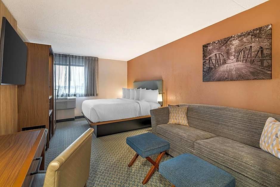 Our spacious, non-smoking King Room ensures a comfortable stay for up to 4 adults and 3 children. Relax in the private bathroom with a bathtub, enjoy modern amenities such as a flat-screen TV, microwave, and refrigerator, and experience a restful night's sleep on the king-size bed or sofa bed.