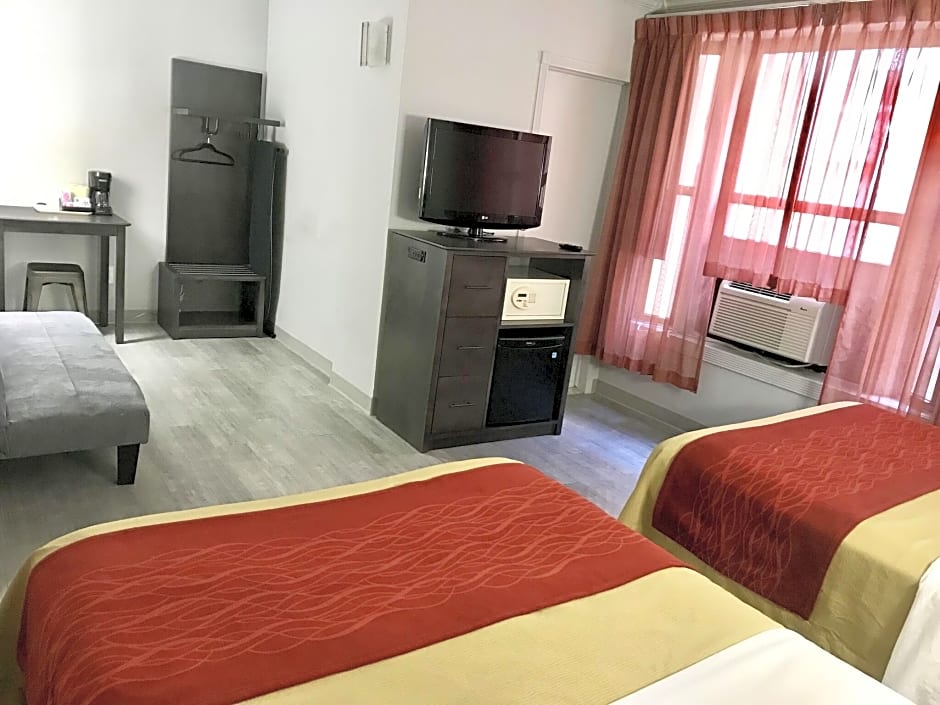 This room with 2 double beds has a Mini Fridge, Iron & Iron board, Safe Deposit Box, Coffee machine and flat-screen TV with cable channels.