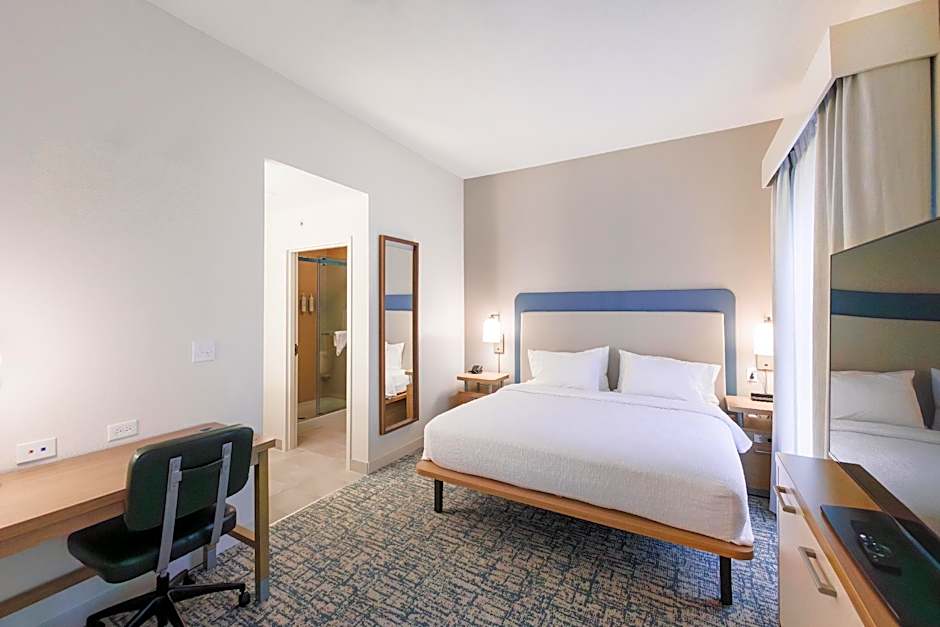 This hearing accessible non-smoking studio suite features one king-sized bed, visual alarm and notification devices for the doorbell or door knock and incoming telephone calls. This suite has a kitchen built to lower scale with full-sized refrigerator, microwave, dishwasher and twin burner stove - plus utensils - to make dining in easy. For added convenience and flexibility, there is a HDTV, a full-sized sofa sleeper as well as an additional work table and chair, separate from the dining area table. This suite will keep you connected with complimentary high-speed internet access, telephone, and alarm clock with MP3 player capabilities and pre-set local radio stations. Any corresponding photo may not reflect the specific accessible room type or room feature.
