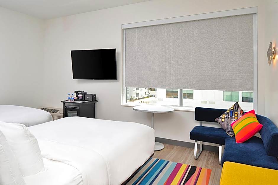 Guest rooms come in several configurations, including options with a King bed or two Queen beds, all featuring air conditioning and soundproofing. The property offers a range of room types such as Aloft, King; Savvy, King; Savvy, 2 Queen, and more, ensuring a comfortable setup for various travelers.