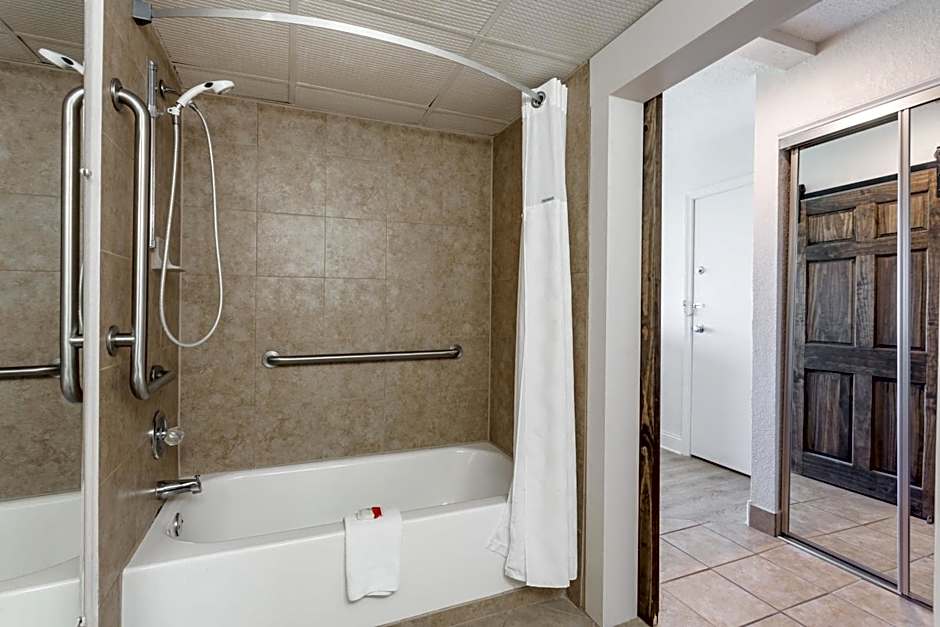This room offers handicap-accessible amenities, including an adapted bathroom with safety grab bars.