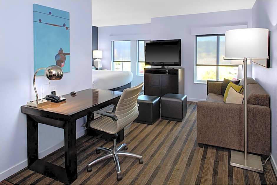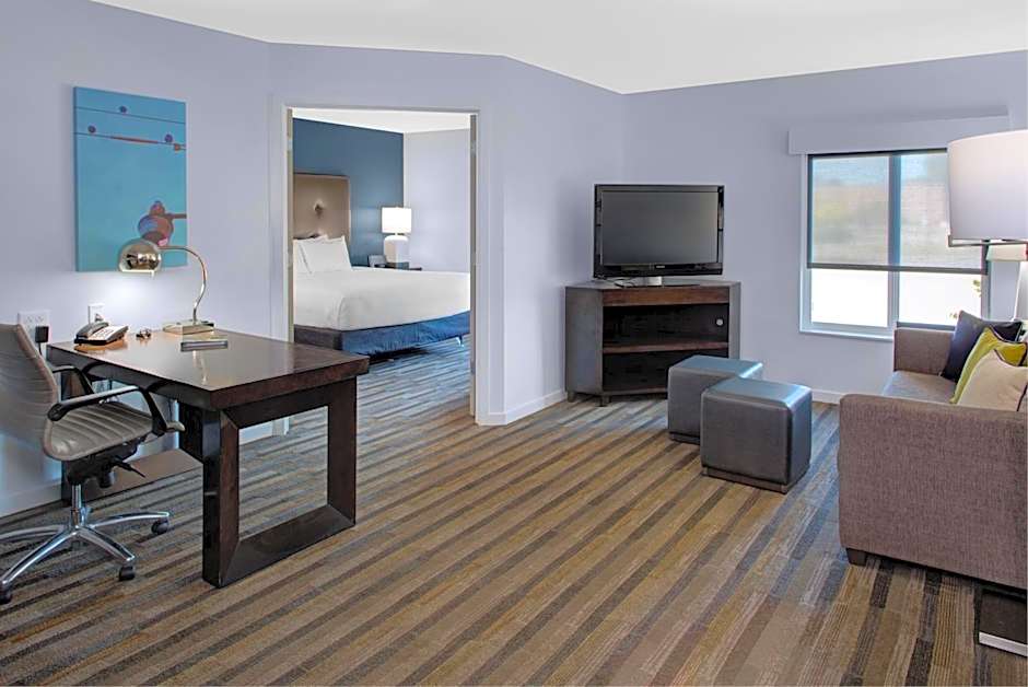 This suite has a full kitchen and separate living area with a sofa bed. The bathroom has an accessible bath tub.
