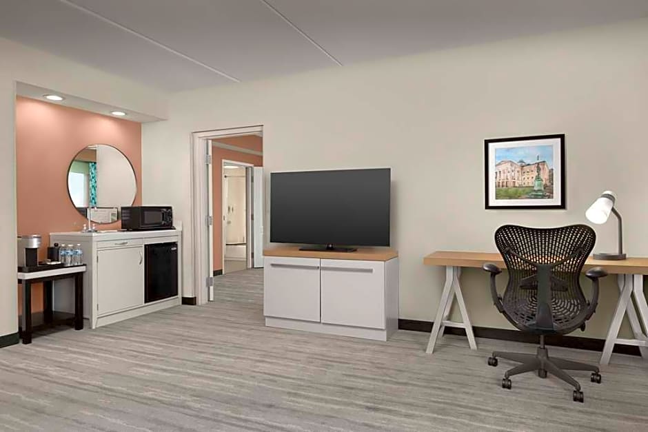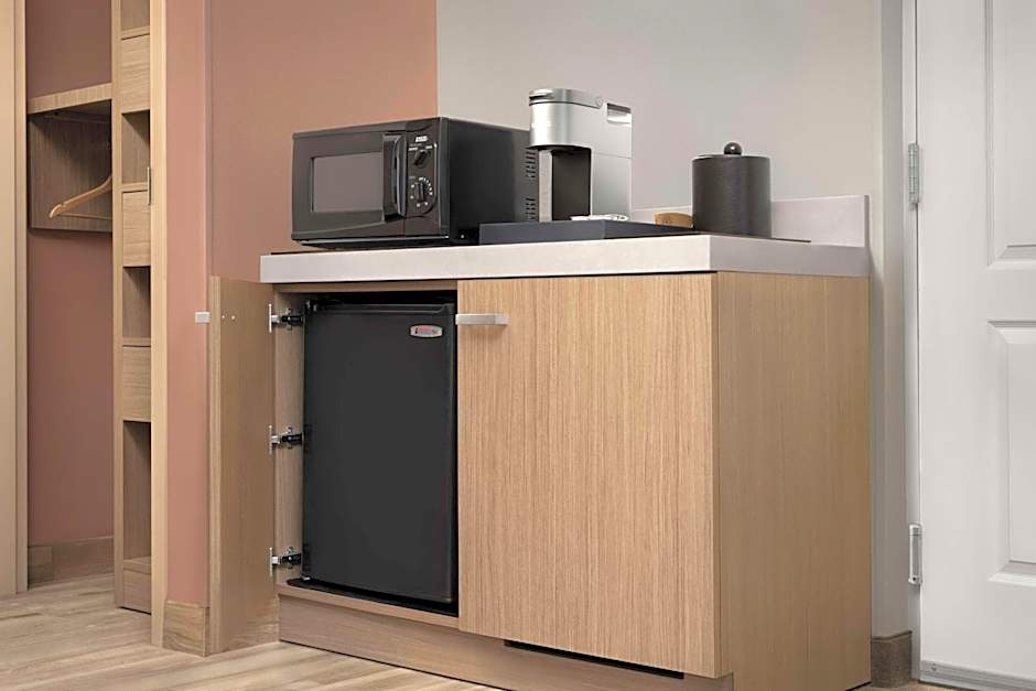 Suite features a microwave, a small refrigerator and a seating area.