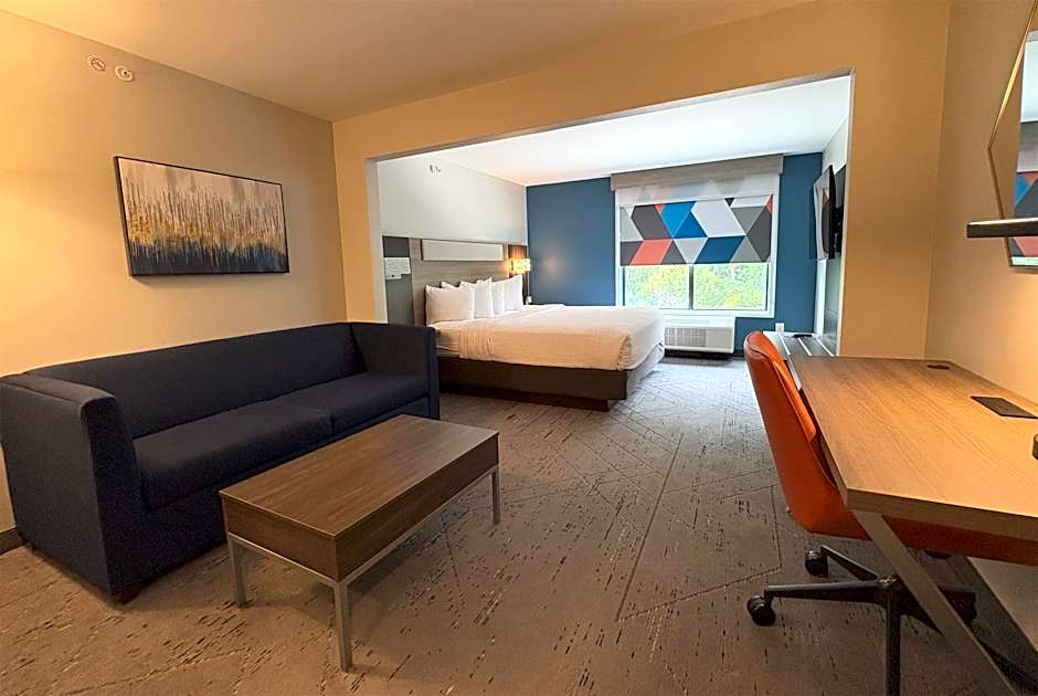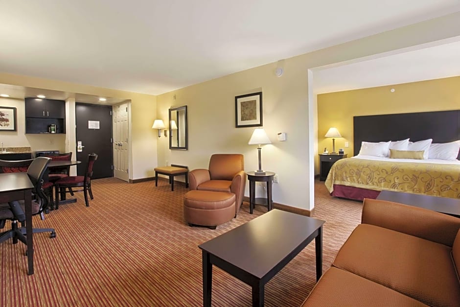 Stretch out and relax in our spacious King Studio Suite, designed with comfort and convenience in mind. This open-concept suite features a cozy seating area with a sofa, a dedicated bedroom area with a plush king-size bed, and a dining table perfect for meals or work. The wet bar is equipped with a microwave, mini-refrigerator, sink, and coffee maker, making in-room snacks and refreshments a breeze.