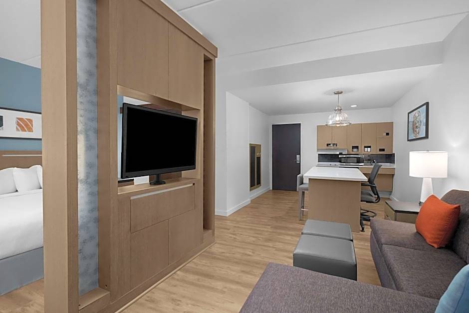 This suite features a flat-screen TV, kitchenette, and microwave. The separate seating area has a sofa bed.