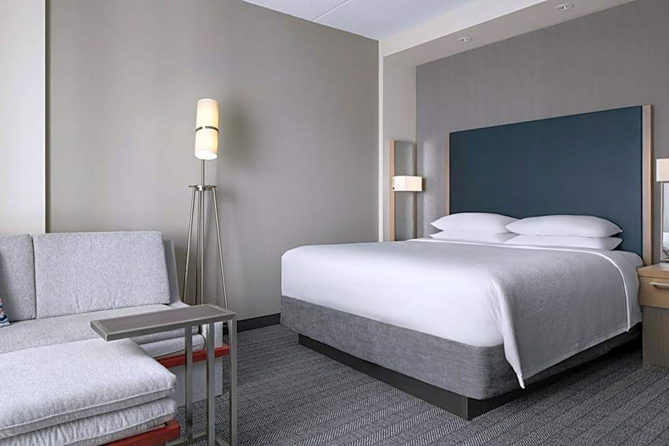 The hotel offers a King Room with Sofa Bed, a 1 Bedroom Suite with 2 Queen Beds and a Sofa Bed, and a Queen Room with Two Queen Beds. All rooms do not allow smoking and can accommodate 2 adults. The King Room with Sofa Bed has a room size of 366 sqft, while the Queen Room with Two Queen Beds has a room size of 388 sqft. The bed sizes are 1 x King size bed and 1 x Sofa Bed in the King Room, while the Queen Room has 1 x King size bed.