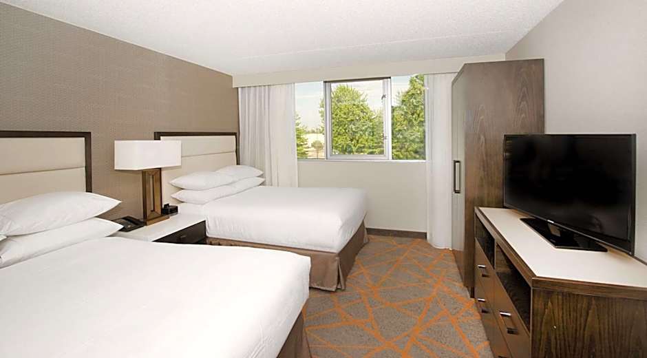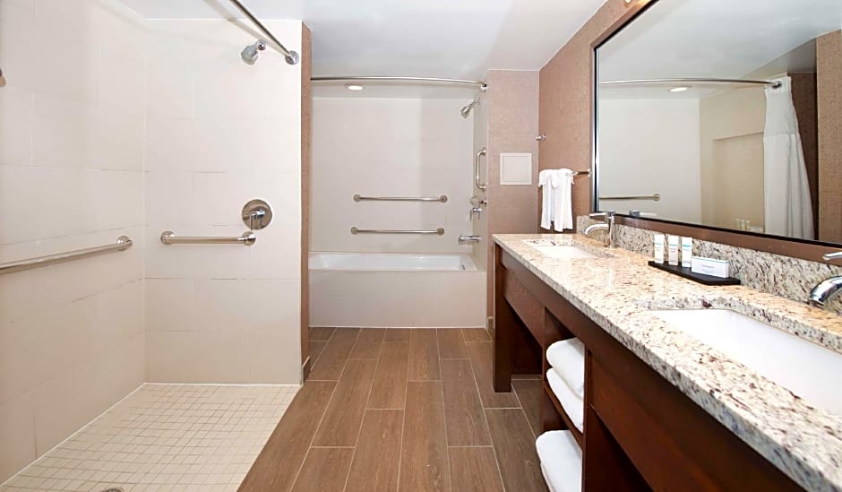 The Embassy Suites by Hilton Cincinnati Northeast - Blue Ash offers a variety of room types, including double rooms with roll-in showers and a patio, two-room king suites with a balcony, non-smoking basic double/double suites, one bedroom suites with disability access/bath tub, king rooms with hearing accessibility, and king suites. The rooms range in occupancy from accommodating 4 adults and 3 children to 6 adults and 4 children. All rooms are non-smoking and have an average size of 495 sqft.