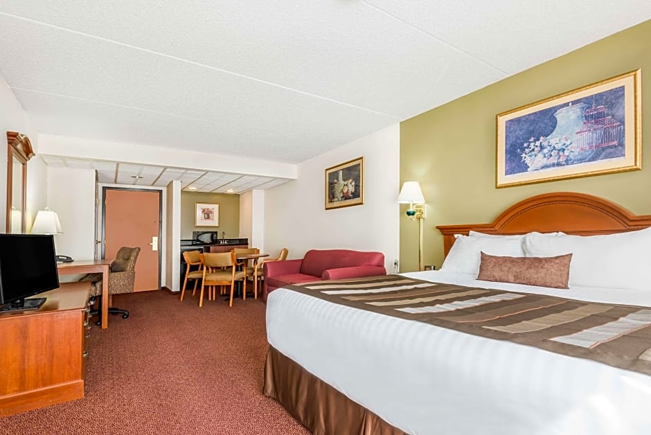 This spacious suite features a seating area with a sofa bed, flat-screen HDTV and desk. A microwave, refrigerator and coffee maker are also included.