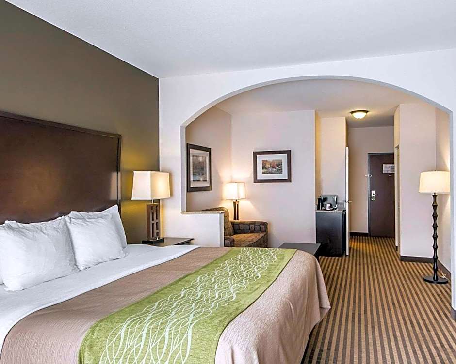 Comfort Inn & Suites offers a variety of room types including Queen Room, Standard King Room, Standard Queen Room with Two Queen Beds, King Suite with Sofa Bed, and Standard Queen Room. All rooms are non-smoking and can accommodate between 2 to 4 adults and 1 to 3 children, depending on the room type. The bed sizes range from Queen to King, with some rooms also including a sofa bed.