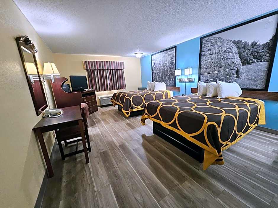 Super 8 by Wyndham Clinton offers a variety of room options including King Rooms, Queen Rooms with different bed configurations, some of which are mobility accessible. All rooms are non-smoking and have similar room sizes at 323 sqft. The occupancy ranges from 2 adults, 1 child, up to 4 adults, 2 children.