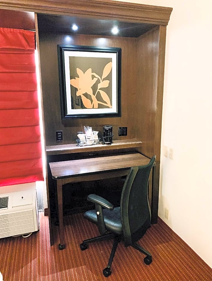 This room features a work desk and a flat-screen TV with pay-per-view channels. A microwave and a refrigerator are also provided.