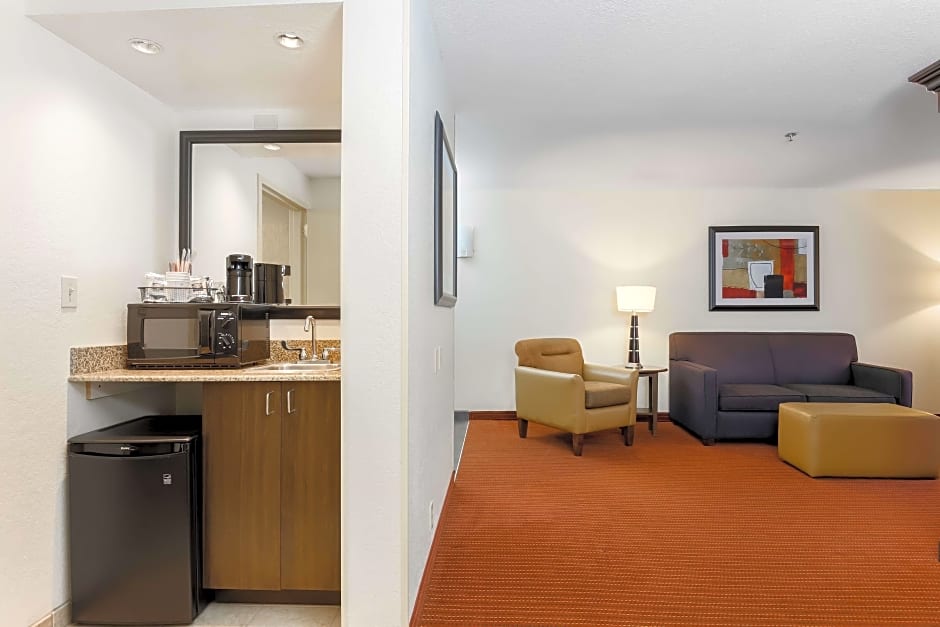 A seating area with a sofa bed and a flat-panel TV is featured in this room. A refrigerator and a microwave are also included.