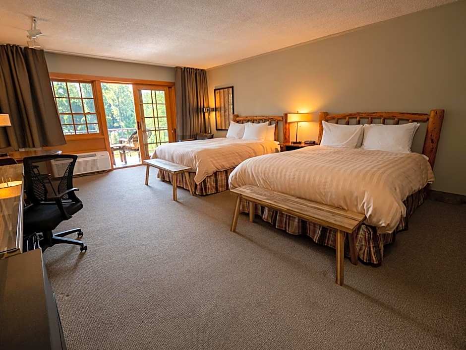 This spacious room features two queen sized pillow-top beds, cable TV with HBO, seating area, work desk and mini refrigerator. This room does not face the river.