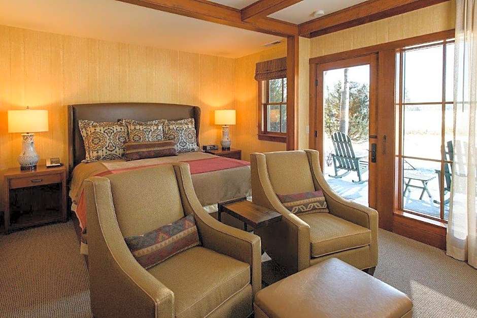 This lodge-style room features a private deck or balcony, river rock wall gas fireplace, a cable flat-screen TV, MP3 docking station, coffee/tea maker, free WiFi, and a small refrigerator.