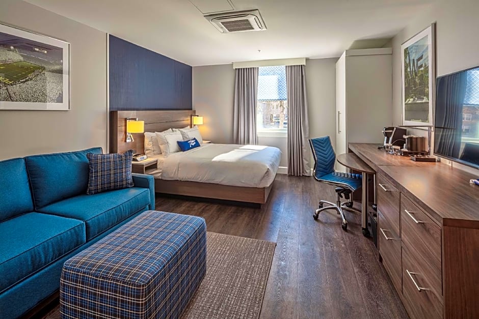 The hotel offers King Rooms with Sofa Bed, Queen Rooms with Two Queen Beds, Queen Rooms with Sofa Bed, and One-Bedroom Suites with Sofa Bed. The rooms are all quadruple occupancy, have a room size of 215 sqft (except for the One-Bedroom Suite which is 420 sqft), and smoking is not allowed. The beds in the rooms vary from Queen size beds to Double beds, and some rooms also have a sofa bed.