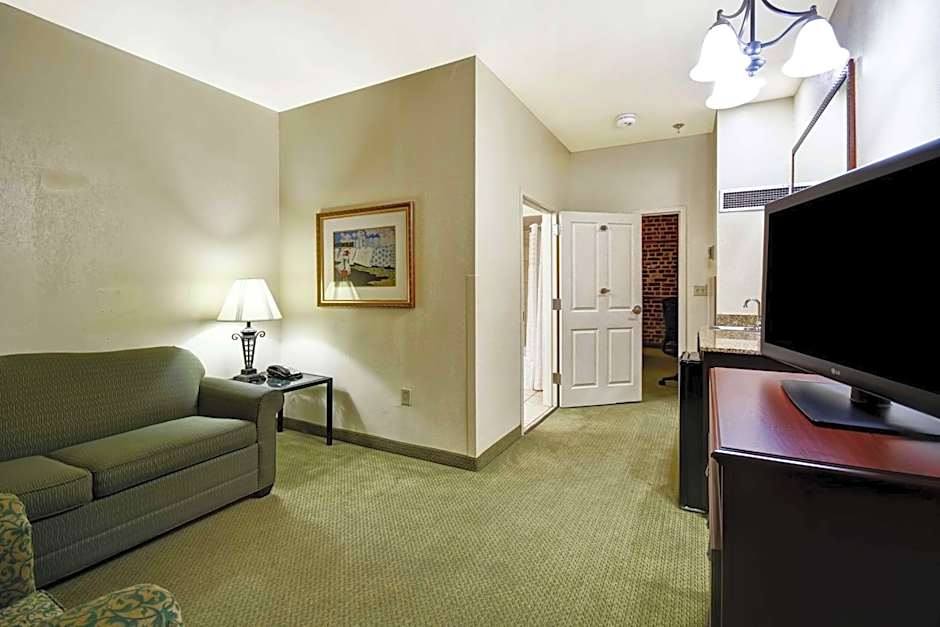 Suite features a flat screen TV and a armchair. The bathroom includes a vanity and a tub with shower.