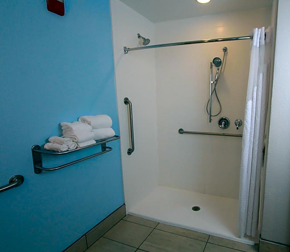 This accessible room features visual telephone and door alarms. A roll-in shower, microwave, and small refrigerator are also included.
