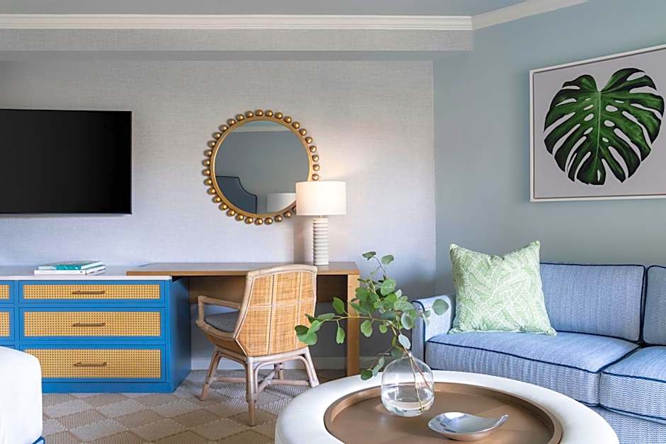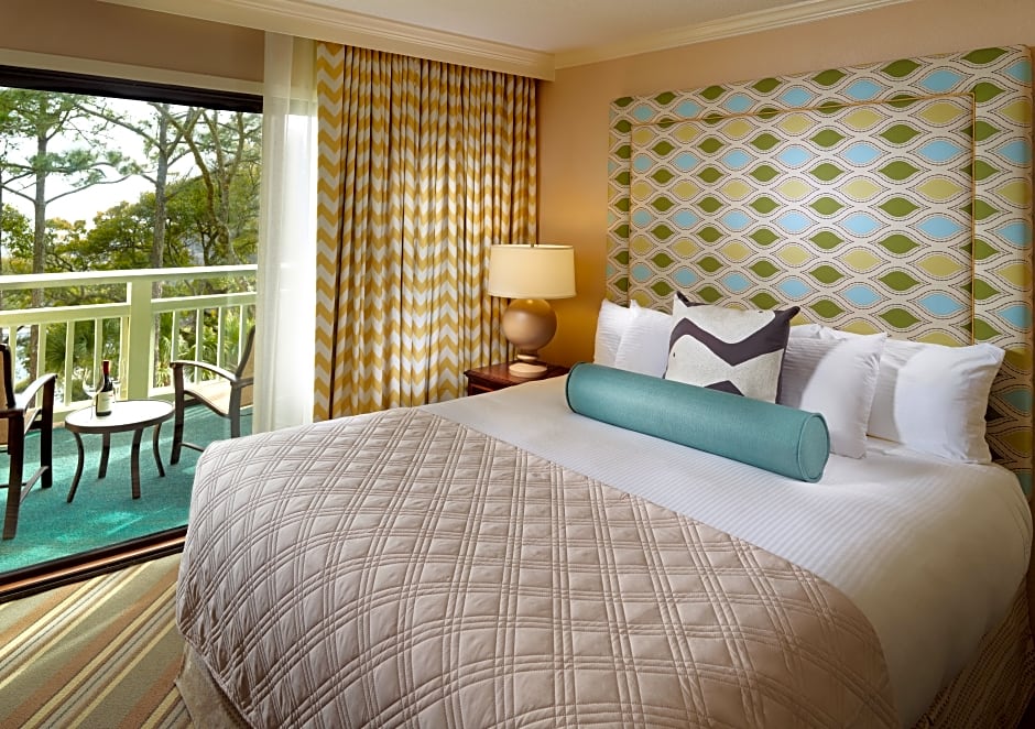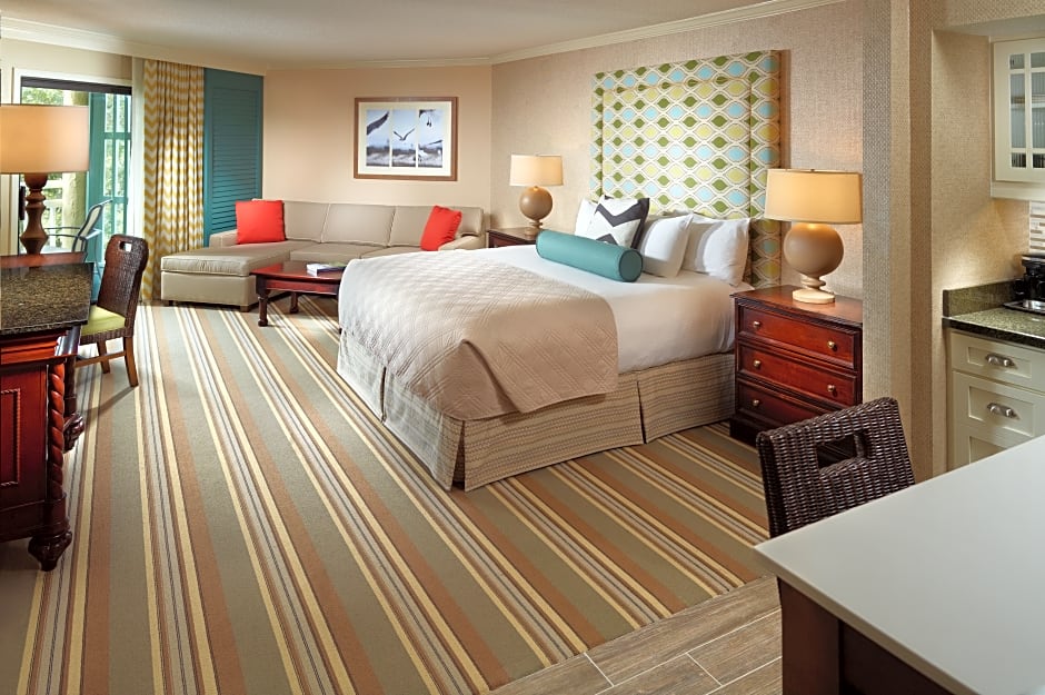This 530-square-foot studio suite includes a kitchenette and a private balcony with views of the landscaped grounds, including oaks and palmetto trees.