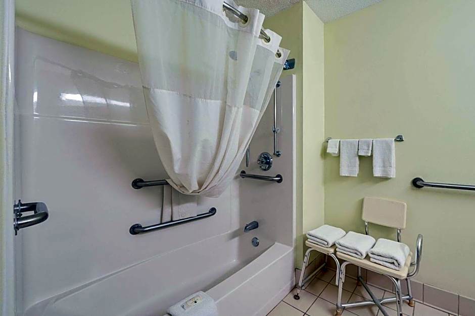 At Quality Inn & Suites South, the hotel offers a Queen Room with Accessible Tub, a Queen Room with Two Queen Beds, and a King Room. The Queen Room with Accessible Tub is available in both accessible and non-smoking options, accommodating 2 adults and 1 child with a Queen size bed. The Queen Room with Two Queen Beds is a non-smoking room option that accommodates 4 adults and 3 children with two Queen size beds. For guests who prefer a smoking room, there is also a Queen Room with Two Queen Beds option available.