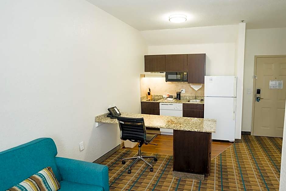 This suite features a fully equipped kitchen, 32-inch flat-screen cable TV, and seating area with a sofa bed.