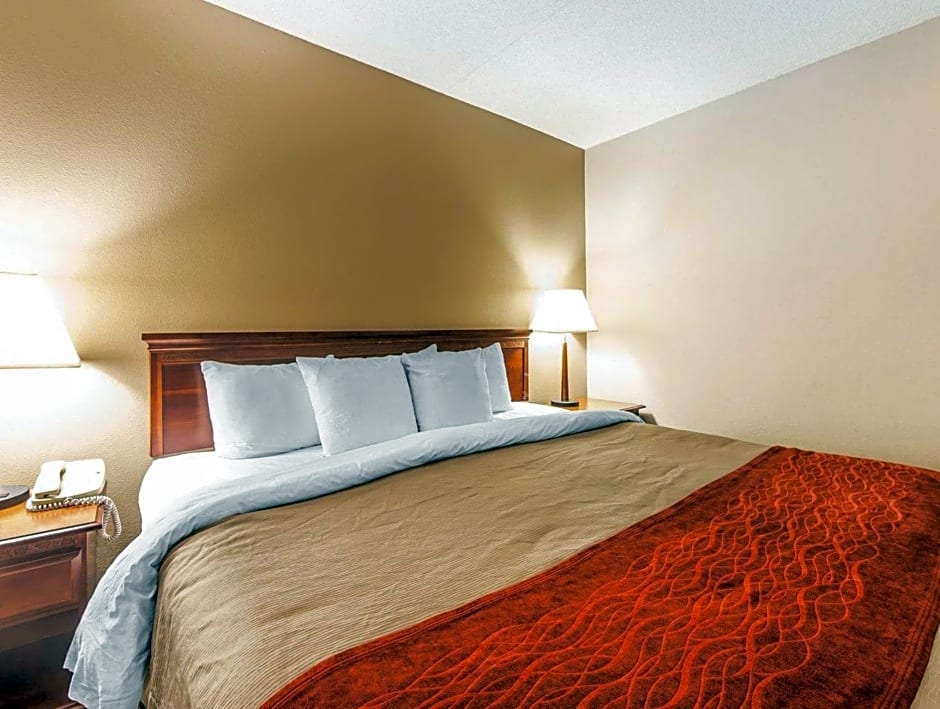The Comfort Inn & Suites Lookout Mountain offers a variety of room types including Queen Rooms with Two Queen Beds, Queen Suites with Two Queen Beds, King Suites, and King Rooms. All rooms are non-smoking and have different sizes ranging from 301 sqft to 377 sqft. The occupancy varies, accommodating 2 adults and 3 children up to 6 adults and 4 children. Bed sizes include Queen and King size beds, with some rooms also featuring a sofa bed.