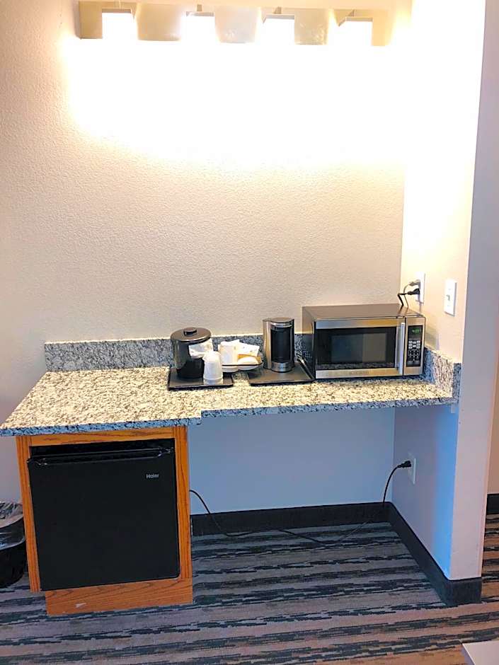 This room includes a microwave, small refrigerator and a coffee maker. Ironing facilities are also provided.