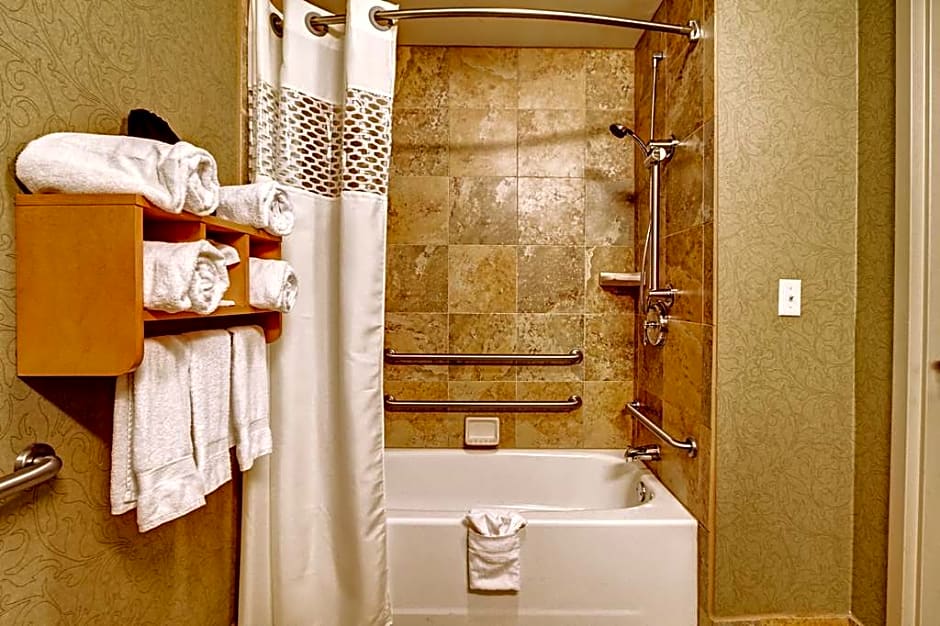Extra large mobility accessible room with king-sized bed and roll-in shower or tub. Features: flat-screen TV, Free WiFi, coffeemaker, iron, and hairdryer. Any corresponding photo may not reflect the specific accessible room type or room feature.