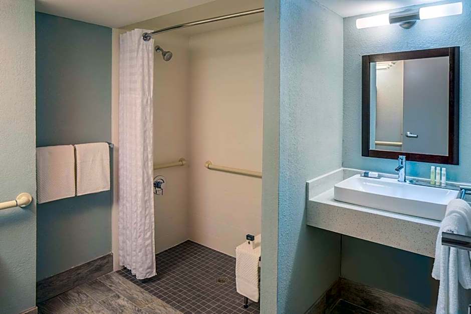 This mobility-accessible room features a roll-in shower. WiFi is available with wireless printing. The room also includes a 42" TV, an MP3 alarm clock, and ironing facilities. A refrigerator and coffee machine are included.