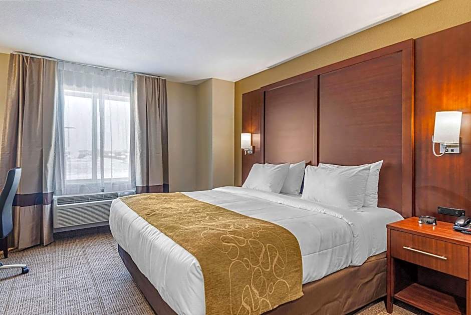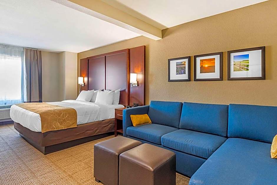 The Comfort Inn & Suites hotel offers various types of rooms including King Suites, King Rooms, Queen Rooms with Two Queen Beds, and accessible rooms. All rooms are non-smoking. The King Suites and King Rooms accommodate 2 adults and 1 child, while the Queen Rooms with Two Queen Beds and accessible rooms accommodate 4 adults and 3 children. The King Suites and King Rooms have a single King size bed, while the Queen Rooms have two Queen size beds.