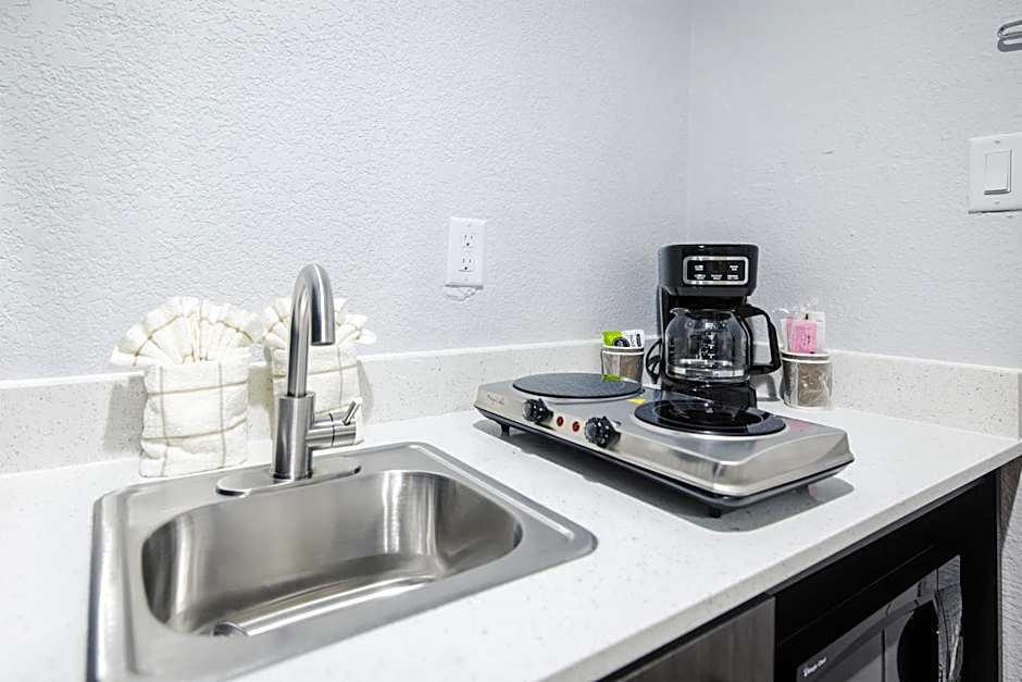 A satellite TV with premium channels is featured in this room. A fridge, microwave and work desk ,Kitchenette with a Stovetop with Kitchenware and Utensils are also included.